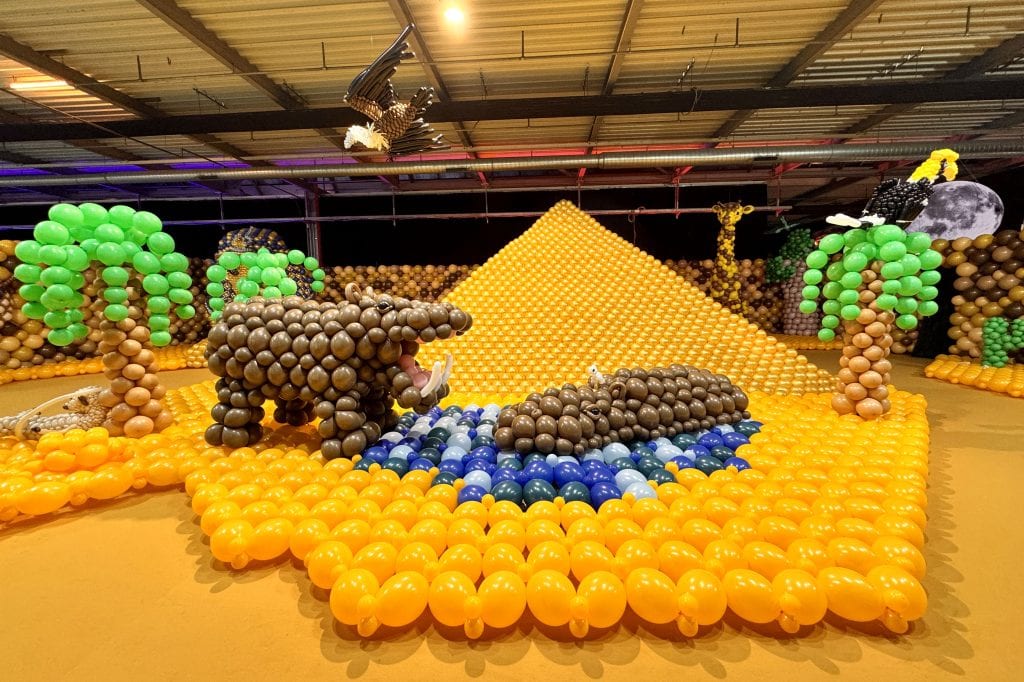 Auf rund 3.500 Quadratmetern breitet sich eine begehbare Fantasielandschaft aus, die fast vollständig aus Luft besteht. Über 500.000 handgefertigte, natürliche und vollständig kompostierbare Ballons formen Tiere, Dschungelszenen, Unterwasserwelten und weltberühmte Wahrzeichen. Bis zu acht Meter ragen die Installationen in die Höhe. Was sonst leicht und vergänglich wirkt, wächst hier zu monumentalen Skulpturen heran. Rund 100 Beteiligte arbeiteten zwei Wochen am Aufbau; nahezu 100 internationale Künstlerinnen und Künstler aus vier Kontinenten verwandelten die Halle unter der künstlerischen Leitung von Guido Verhoef in eine Expedition durch fünf Kontinente.
