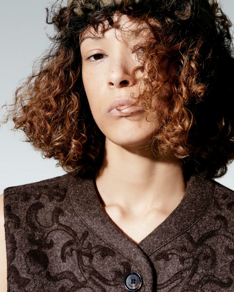 Auch die Damenkollektion bleibt dieser Bewegung treu. Langgestreckte, mehrschichtige Silhouetten, flache Schuhe, markante Hüte. Satin trifft auf Tweed, Wildleder auf Strick, Denim auf feine Wolle. Paisley erscheint neben Jacquards, Fischgrat und Animal-Anklängen. Knitwear in voluminösen Formen bildet das Herzstück – Zopfmuster aus Mouliné-Garnen, weich und zugleich strukturiert. Abends reduziert sich die Palette auf Schwarz und Weiß, die Linien werden skulpturaler, die Details feiner.