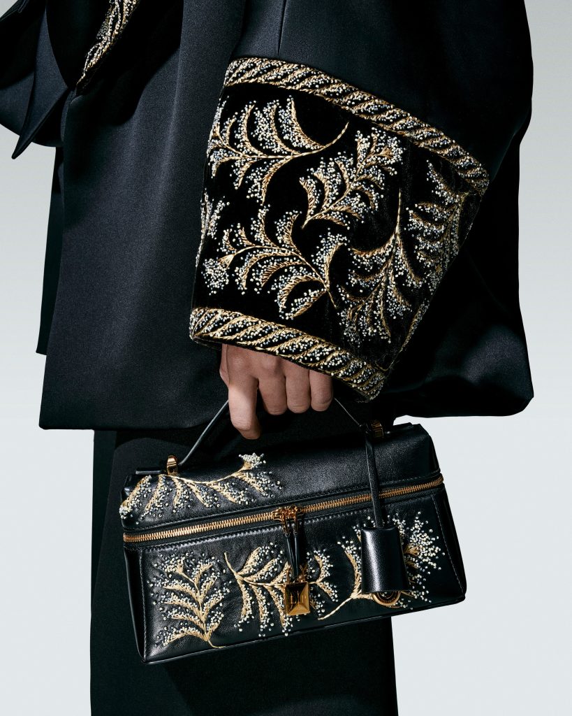 Accessoires erweitern die Erzählung: die Extra Softy Bag, Bale und Loom in butterweichem Leder oder textilen Varianten; Schultertücher mit archivalischen Motiven; eine Minaudière aus geblasenem Murano-Glas als stiller Höhepunkt handwerklicher Virtuosität.