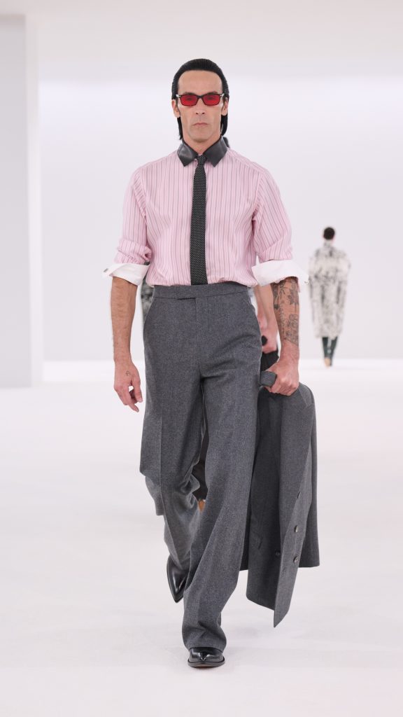 Unter der kreativen Leitung von Haider Ackermann entwickelte das Haus eine Kollektion, die sich ganz auf die Spannung zwischen Präzision und Verführung konzentriert. Im Zentrum stand der archetypische Tom-Ford-Anzug – ein Kleidungsstück, das seit Jahrzehnten für Macht, Eleganz und Selbstbewusstsein steht. Ackermann nahm diesen Klassiker und verschob ihn nur minimal. Revers wurden länger, Hosen leicht ausgestellt, Schultern scharf gezeichnet. Es sind kleine Veränderungen, die große Wirkung haben. Die Silhouetten wirken vertraut und gleichzeitig neu, als hätte jemand die Regeln der klassischen Schneiderkunst leise neu geschrieben.