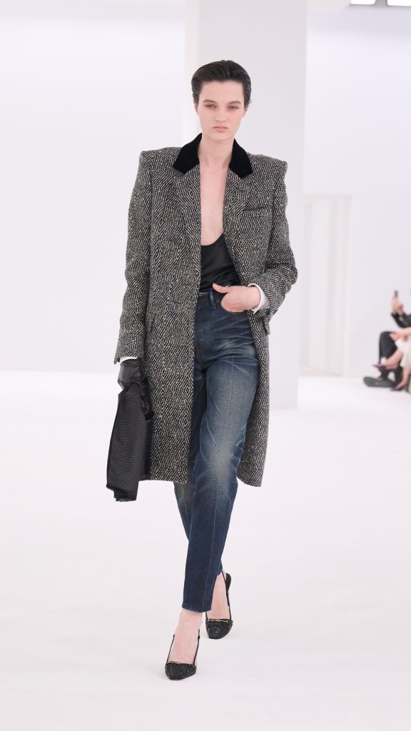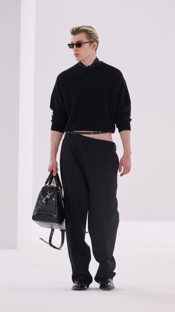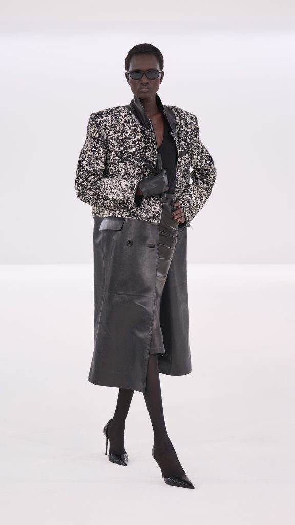 Gerade diese Gegensätze gaben der Kollektion ihre Energie. Weiche Materialien trafen auf harte Oberflächen, strenge Linien auf subtile Sinnlichkeit. Manche Looks wirkten bewusst leicht zerknittert – als hätten sie bereits ein Kapitel Nachtleben hinter sich. Ein Smoking mit minimal gelockerter Silhouette, ein Mantel, der über einem transparenten Hemd getragen wird, ein Lederrock mit spiegelnder Oberfläche. Es sind Kleidungsstücke, die Eleganz nicht als Distanz verstehen, sondern als eine Form von Selbstbewusstsein.