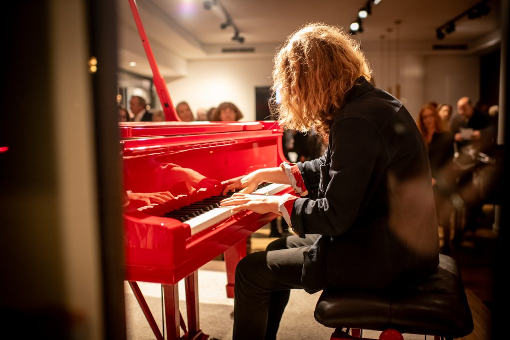 Dass diese Arbeiten ausgerechnet in den Räumen von Steinway & Sons gezeigt wurden, verstärkte die inhaltliche Verbindung auf beinahe selbstverständliche Weise. Der Ort, international Synonym für höchste Klangkultur, wurde an diesem Abend zur Bühne eines stillen Dialogs zwischen zwei Ausdrucksformen. Im Zentrum: ein roter Steinway-Konzertflügel D-274, der mit einem Motiv aus Fiereks Serie inszeniert war und selbst Teil der künstlerischen Erzählung zu werden schien.