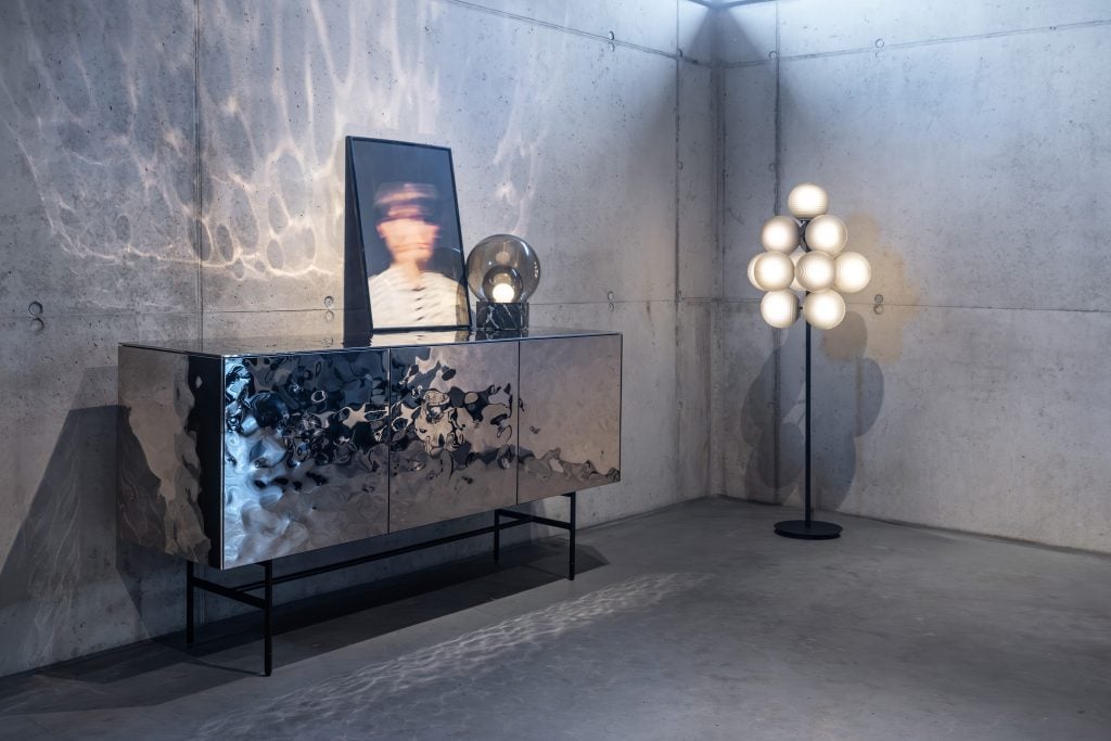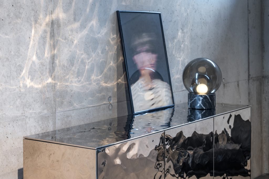 Interessant ist dabei, wie stark die Oberfläche das Verhältnis zwischen Möbel und Raum verändert. WAVE reflektiert nicht nur Licht, sondern bindet auch die Umgebung in seine Wirkung ein. Wände, Boden und angrenzende Materialien werden Teil der Reflexionen und verändern sich je nach Tageszeit oder Beleuchtung.
