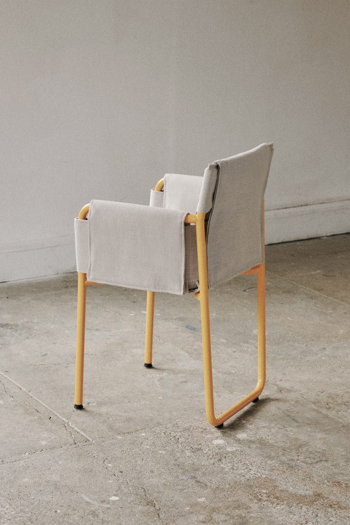 Moritz Gäckles Lap Chair lebt von einem Spiel mit Gegensätzen. Ein gebogenes Stahlrohrgestell bildet die stabile Grundlage, während textile Flächen darüber gespannt werden und den Sitzkomfort erzeugen. Zwischen den Stoffelementen bleibt das pulverbeschichtete Gestell teilweise sichtbar und erzeugt einen spannenden Kontrast zwischen festen und flexiblen Materialien. Der textile Bezug lässt sich über Schraubverbindungen und seitliche Klettsysteme lösen, reinigen oder austauschen. Der Stoff wird so zu einem aktiven Bestandteil des Systems und verändert nicht nur den Komfort, sondern auch die visuelle Wirkung des Objekts.