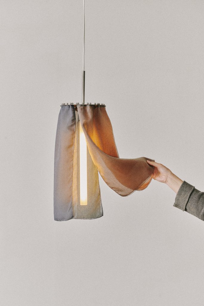 Auch die Leuchte Orbit von Aurelia Pleyer und Lilian Onstenk arbeitet mit der Beweglichkeit von Textil. Ein Stoff hängt locker von einer Metallstruktur herab und erinnert an einen Vorhang. Durch leichte Verschiebungen verändert sich nicht nur die Form des Materials, sondern auch die Wirkung des Lichts. Der Stoff filtert die Lichtquelle und erzeugt unterschiedliche Farbtöne und Atmosphären im Raum. Das Objekt reagiert auf Bewegung und verändert sich im Alltag immer wieder neu. Licht wird so nicht mehr nur als technische Funktion verstanden, sondern als atmosphärisches Element.