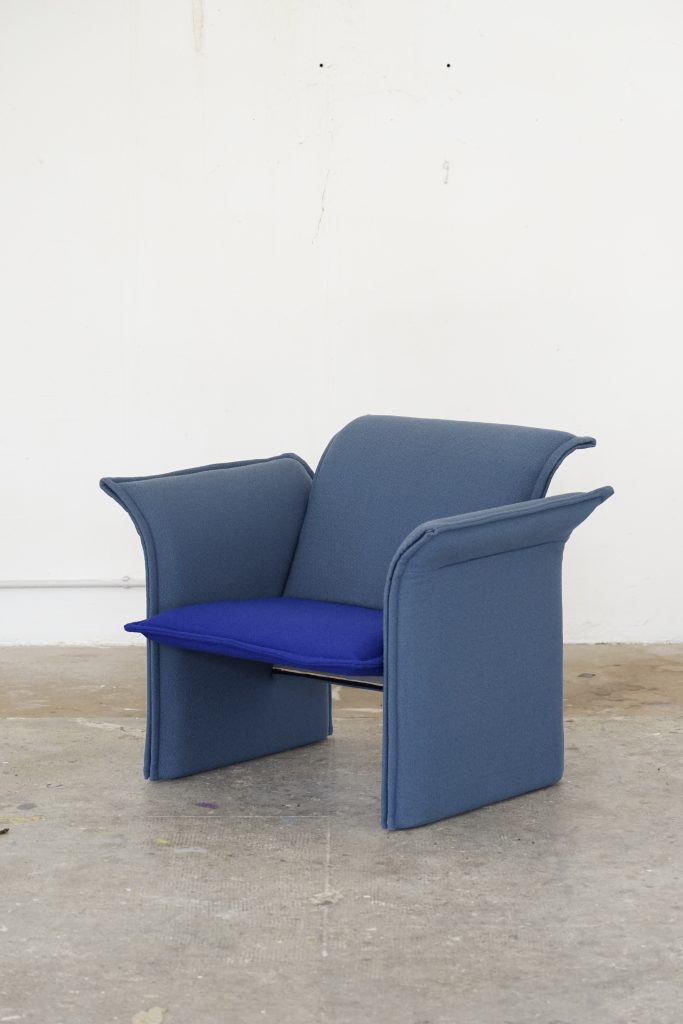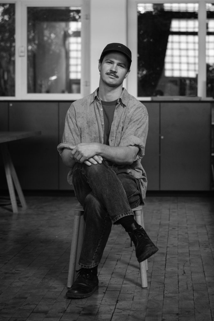 Auch Frederik Buchmann interessiert sich für textile Volumen, allerdings aus einer ganz anderen Perspektive. Sein Sessel Puffy Marcel verzichtet bewusst auf traditionelle Polstertechniken. Statt komplexer Schichtsysteme besteht der Entwurf aus einer einfachen Konstruktion aus Holz und Aluminiumrohren, auf der vier kissenartige Module liegen. Diese bilden gemeinsam eine weiche Sitzlandschaft, deren Komfort aus der Anordnung der Elemente entsteht. Der Körper kommt ausschließlich mit den gepolsterten Flächen in Kontakt, während die Struktur im Hintergrund bleibt. Der Sessel wirkt dadurch leicht und unkompliziert, beinahe beiläufig. Gleichzeitig zeigt er, wie Möbelproduktion reduziert werden kann, ohne auf Komfort zu verzichten.