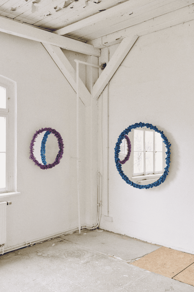 Während viele der Arbeiten mit Textilien als funktionale Elemente arbeiten, nutzt Lukas Heintschel Stoff eher als Mittel der Inszenierung. Sein Drama Spiegel verwandelt eine alltägliche Form in ein kleines Bühnenbild. Die runde Spiegelfläche wird von gerafftem Textil umgeben, dessen Falten und Rüschen dem Objekt eine beinahe theatrale Präsenz verleihen. Der Stoff wirkt wie ein Vorhang, der den Spiegel rahmt und gleichzeitig seine Wirkung verstärkt. Licht spiegelt sich in der glatten Oberfläche und fällt auf die textile Struktur zurück, wodurch der Stoff eine unerwartete Tiefe erhält. Je nach Materialwahl kann der Spiegel warm und wohnlich wirken oder fast futuristisch erscheinen. Das Objekt zeigt, wie stark Textilien die Wahrnehmung eines Designs verändern können.