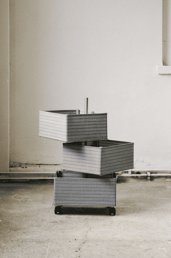 Eine andere Perspektive auf textile Strukturen eröffnet Anna-Lena Wolfrum mit ihrem Trolley Bloc. Ausgangspunkt des Entwurfs ist eine erstaunlich einfache Idee: ein nahezu flaches Stück Stoff in einen räumlichen Körper zu verwandeln. Der textile Loop wird über Edelstahlstäbe gespannt und bildet so eine klare Boxstruktur. Die einzelnen Ebenen sind über eine Achse miteinander verbunden und lassen sich aufdrehen, sodass der Inhalt zugänglich wird. Trotz seiner funktionalen Aufgabe wirkt das Objekt leicht und beinahe grafisch. Der Stoff übernimmt dabei nicht nur eine dekorative Rolle, sondern wird zum strukturellen Element des Möbels.