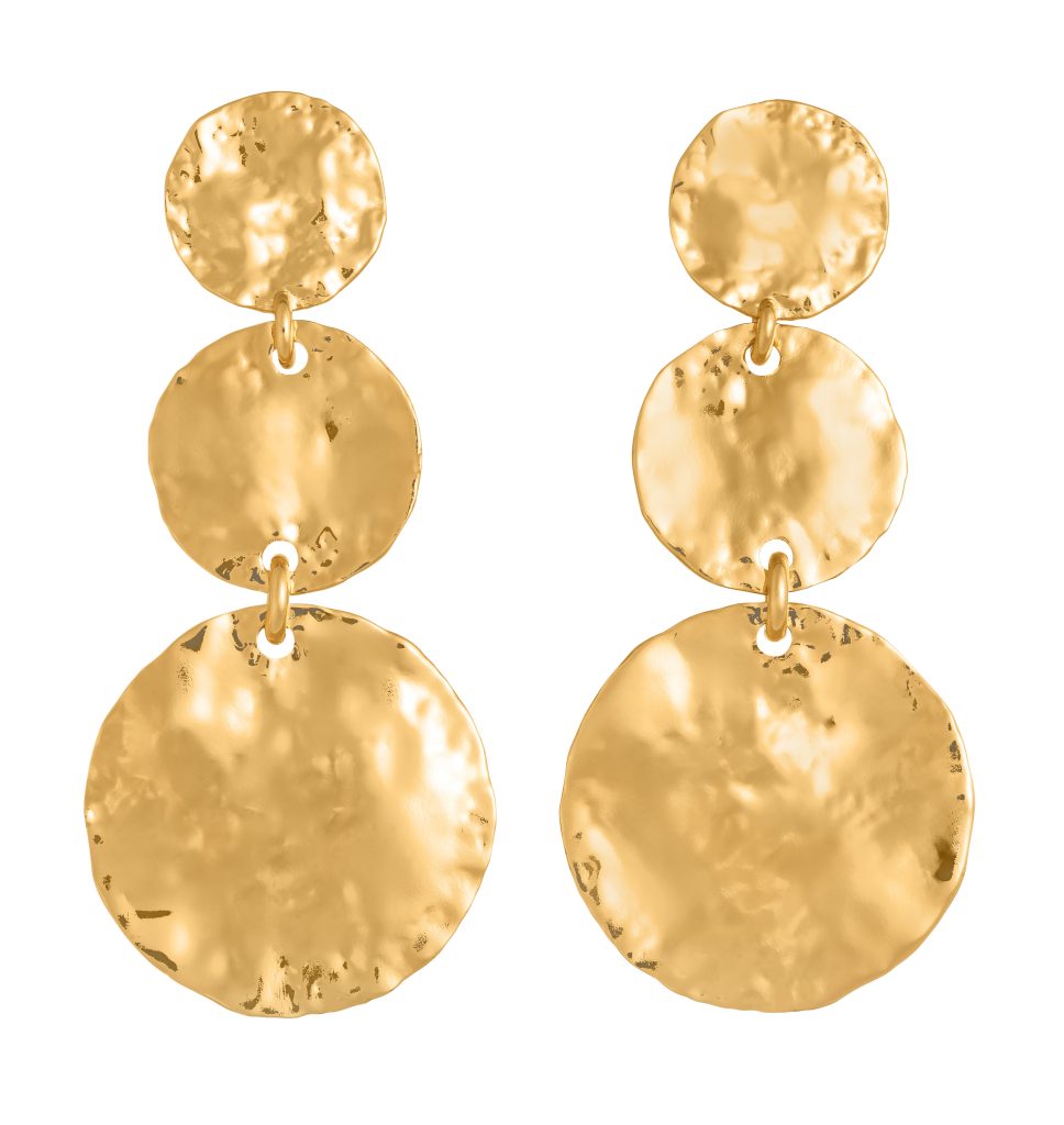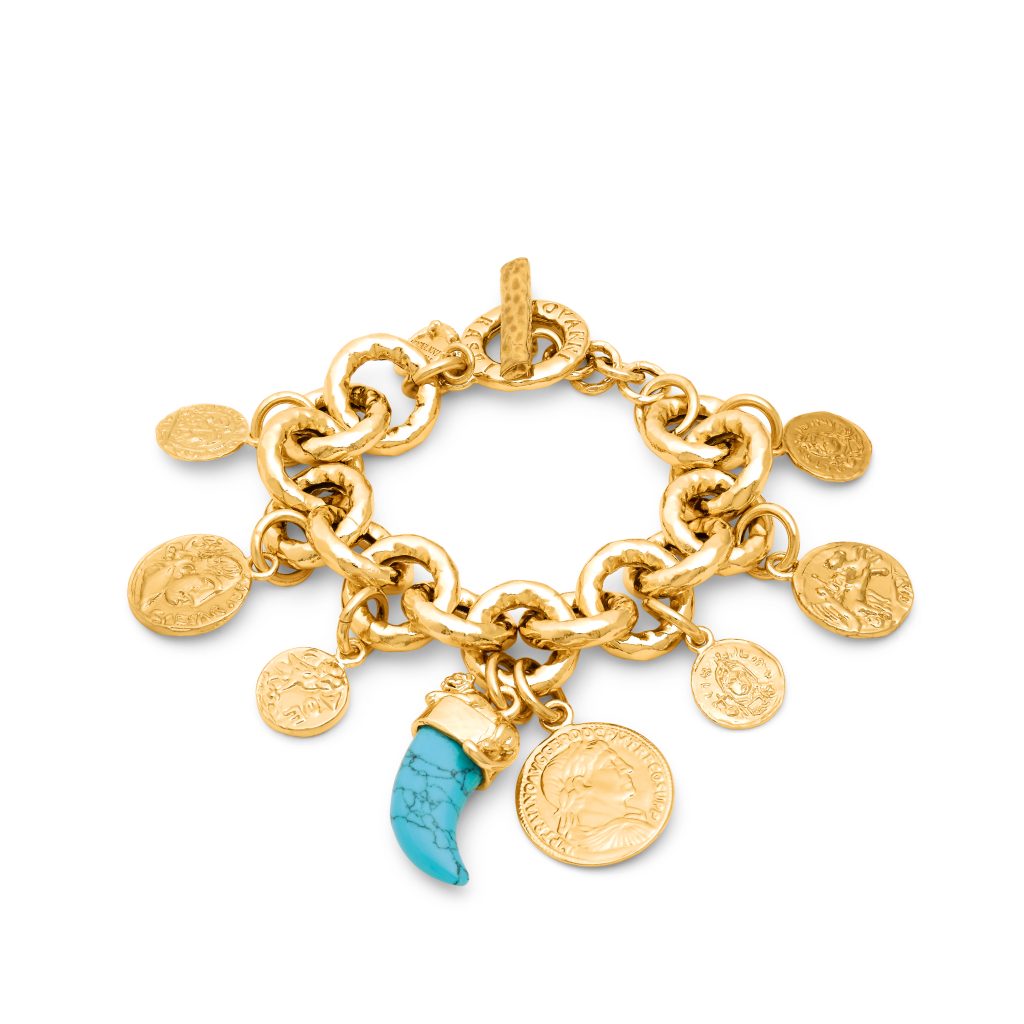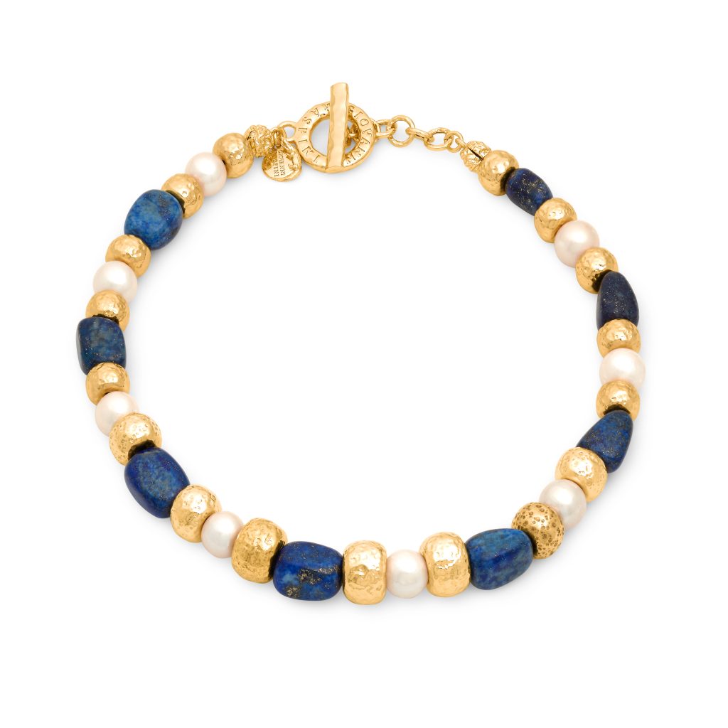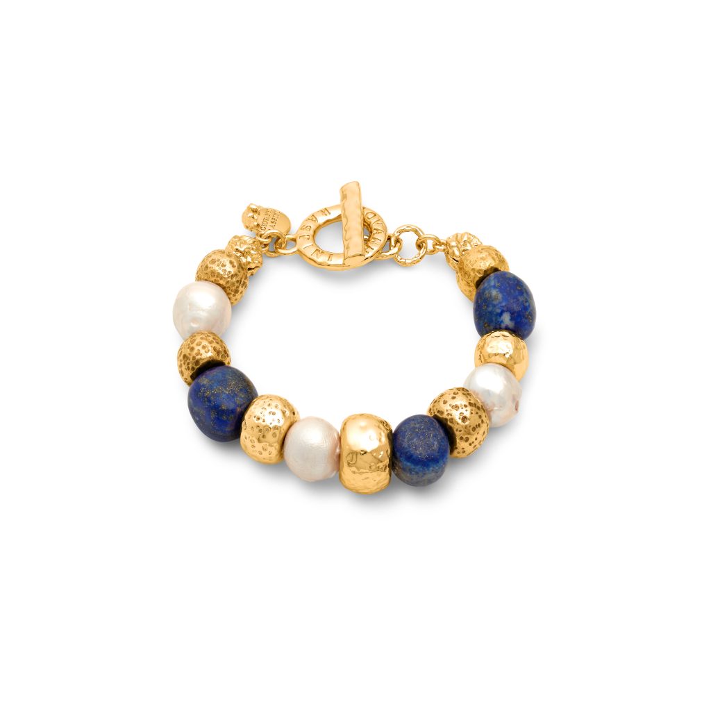 Die Kollektion gliedert sich in drei gestalterische Welten. Die erste konzentriert sich auf feste, skulpturale Formen: Armreifen, Halsketten, Ohrringe, die wie zeitlose Relikte wirken. Texturen erzählen von Transformation, von Hitze, von der Geduld des Materials. Die zweite Welt verbindet Natursteine mit Münzen und gehämmerten Kugeln zu ausdrucksstarken Kompositionen. Hier entstehen Kontraste, die das Auge fordern: die Tiefe des Lapislazuli neben strukturiertem Gold, die transluzente Klarheit von Bergkristall im Zusammenspiel mit warmem Metall. Jede Kombination wirkt wie ein Fundstück aus einer imaginären Reise.