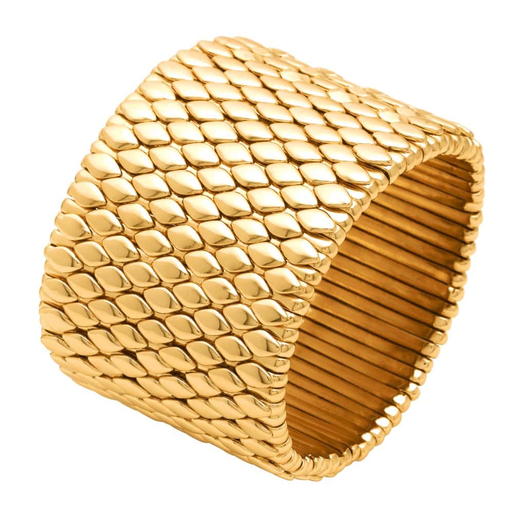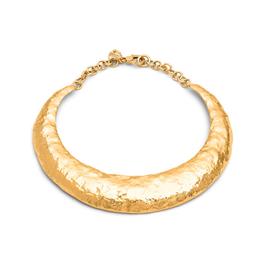 Charakteristisch ist die bewusste Entscheidung für Unregelmäßigkeit. Hämmerungen, Meißelspuren, leichte Unebenheiten – sie sind keine Makel, sondern Signatur. Raspini sucht gezielt den Moment, in dem das Werkzeug auf Metall trifft. Jeder Schlag verändert die Oberfläche, bricht das Licht neu, erzeugt Reflexe, die sich beim Tragen bewegen. Gold wirkt dadurch lebendig, fast atmend. Kein makelloses Finish, sondern vibrierende Struktur.