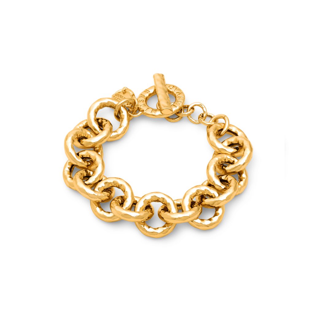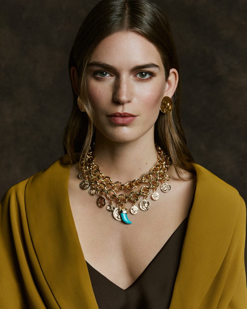 Die dritte Welt schließlich setzt auf große, gehämmerte Ketten mit runden Gliedern. Trotz ihrer Dimension überraschen sie durch Leichtigkeit. Ziselierte Scheiben, Münzen und Hartstein-Anhänger bringen Bewegung ins Spiel. Die Stücke reagieren auf jede Geste, schwingen mit, fangen Licht ein. Präsenz ohne Schwere – ein Balanceakt, der handwerkliche Präzision voraussetzt.