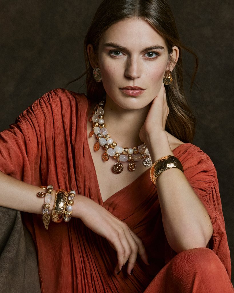 Gefertigt werden die 31 Kreationen in traditioneller Handwerkskunst. Schmelzen, Schmieden, Ziselieren – jeder Schritt bleibt sichtbar. Zum Einsatz kommt Bronze im Goldbad, verarbeitet im Wachsausschmelzverfahren, einer Technik, die seit der Antike komplexe Formen ermöglicht. Diese Methode verleiht den Stücken Tiefe und Plastizität, eine skulpturale Wirkung, die im Licht zusätzliche Spannung gewinnt. Ergänzt wird das Metall durch Bergkristall, Rosenquarz, Lapislazuli, Türkispaste oder große Süßwasser-Barockperlen. Materialien, die in einen Dialog treten – zwischen Transparenz und Opulenz, zwischen kühler Klarheit und warmer Dichte.